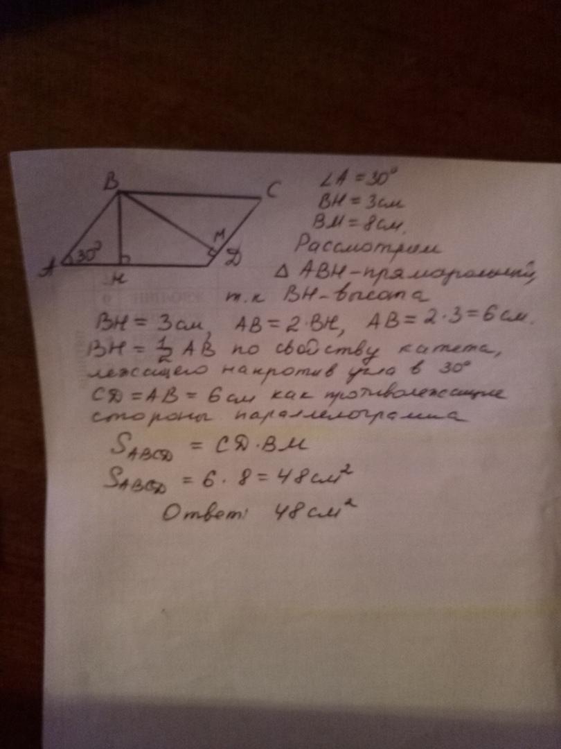 острый угол параллелограмма равен 30 градусов. А высоты проведенные из вершины тупого угла равны 8 см и 3 см. Найти площадь параллелограмма.