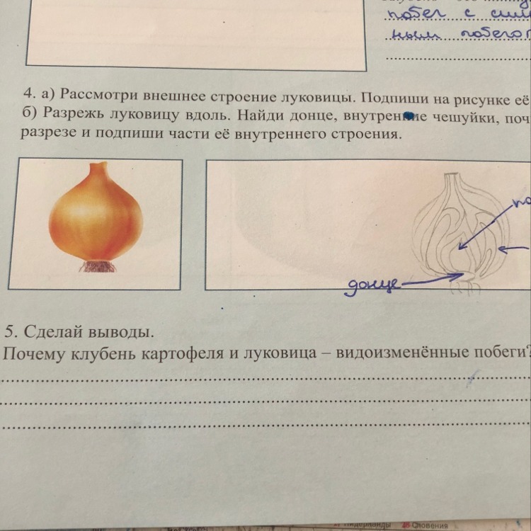 У клубня картофеля есть глазки и бровки. У луковицы - чешуи (листья), донце. (стебель)