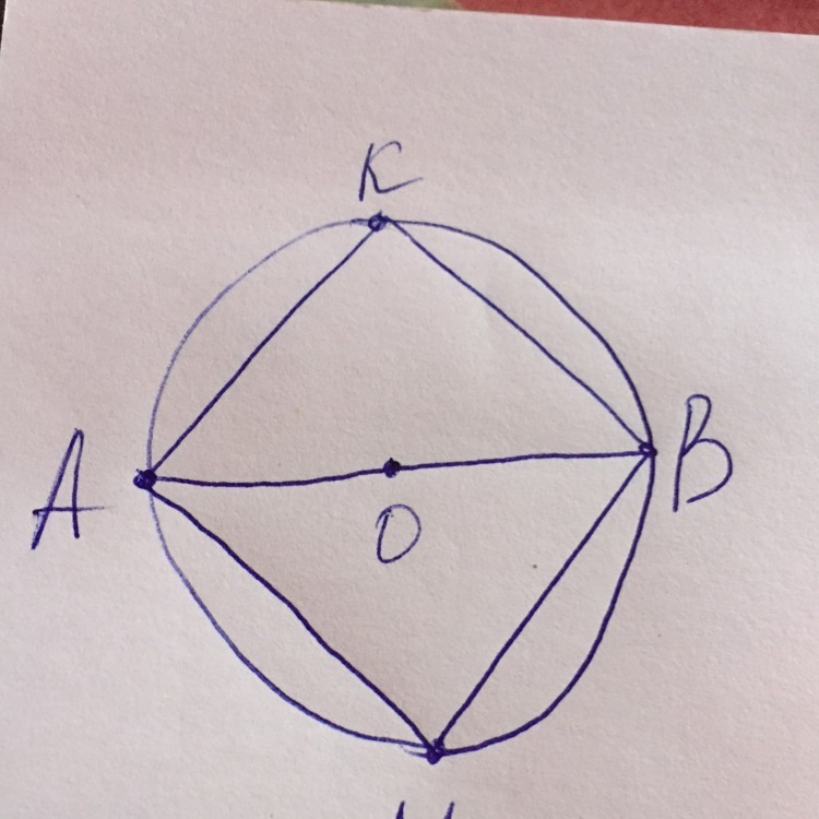 Начертите окружность с центром в точке O. Проведите диаметр AB. Отметьте на окружности AKB. Постройте треугольник AMB и AKB. Убедитесь, используя угольник, что эти треугольники имеют прямые углы.