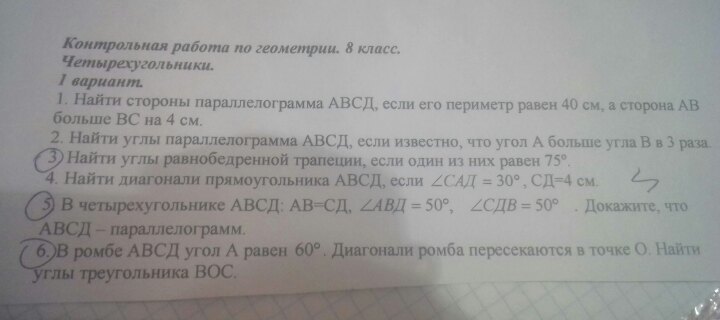 3.Углы в равнобедренной трапеции при основании равны ,значит угол А=D=75,а угол B=C=(360-(75*2)):2=105