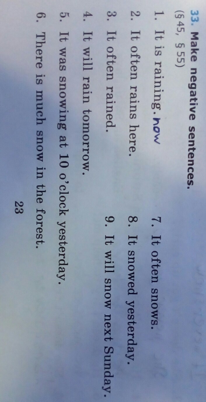 1. It isn't raining now.2.It doesn't often rain here.3.It didn't often rain.4.It won't rain tomorrow.5.It wasn't snowing at 10 o’clock yesterday .6.There isn't much snow in the forest.7.It doesn't often snow .8.It didn’t snow yesterday .9.It won't snow next Sunday.