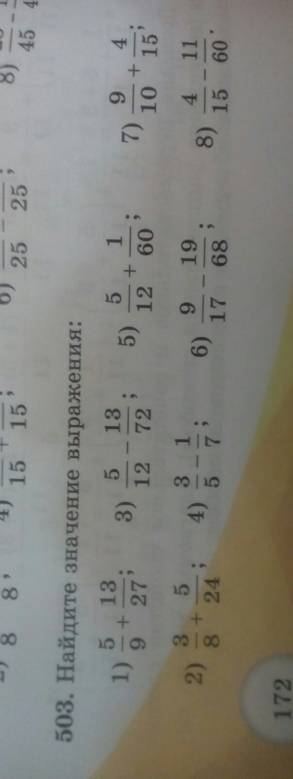 1)5/9+13/27= 28/27; 2)3/8+5/24=14/24:2=7/12;3)5/12-13/72=17/72;4)3/5-1/7=16/35;5)5/12+1/60=26/60:2=13/30;6)9/17-19/68=17/68 7)9/10+14/15=35/30:5=7/6; 8)4/15-11/60=5/60:5=1/12; (в некоторых ответах дробь сокращена)