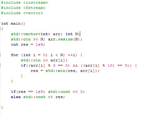 определить наименьшее число кратное 3 и оканчивающееся на 5. Сначала подается количество чисел в последовательности, а затем сами числа.