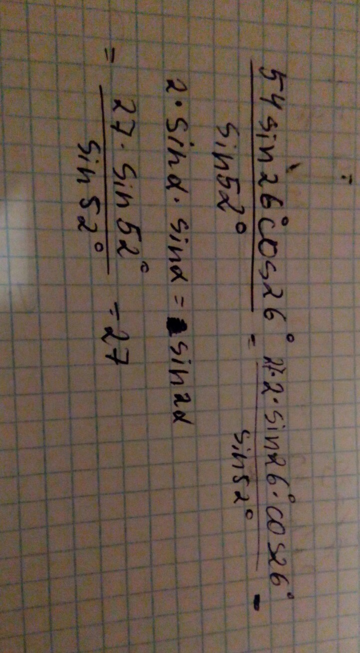 Найдите значение выражения: {54sin26 градусов *cos 26 градусов }/{sin 52 градуса}.