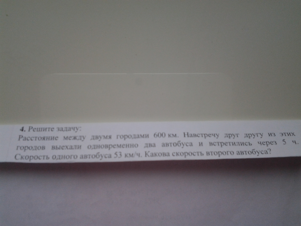 расстояние между двумя городами 600 км. навстречу друг другу из этих городов выехали одновременно два автобуса и встретились через 5 часов.скорость одного автобуса 53 км/ч.какова скорость второго автобуса.