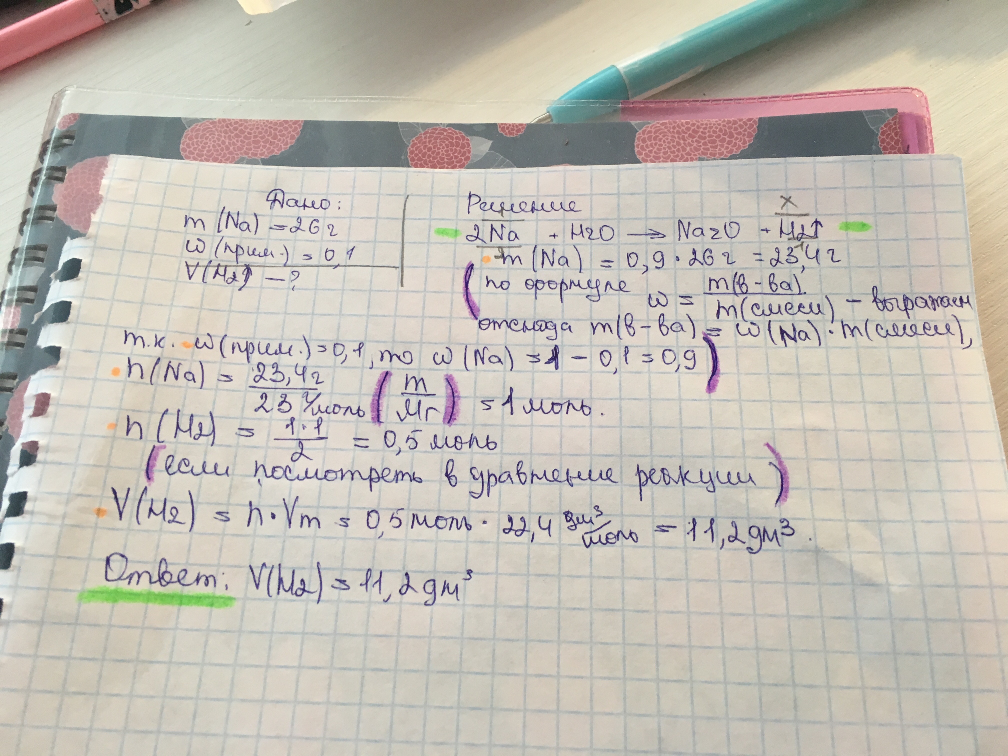 какой обьем водорода выделится при взаимодействии с водой 26г натрия, содержащего 10% примеси?