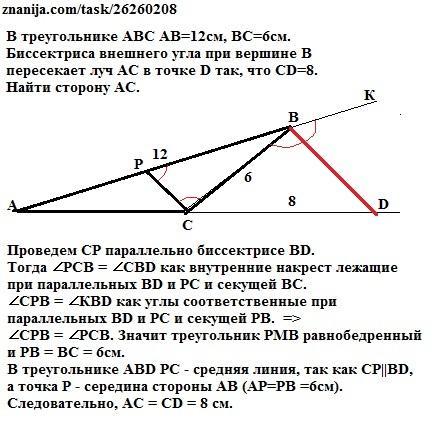 в треугольнике АВС АВ=12см, ВС=6см. Биссектриса внешнего угла при вершине В пересекает луч АС в точке D так, что СD=8. Нийти сторону АС.