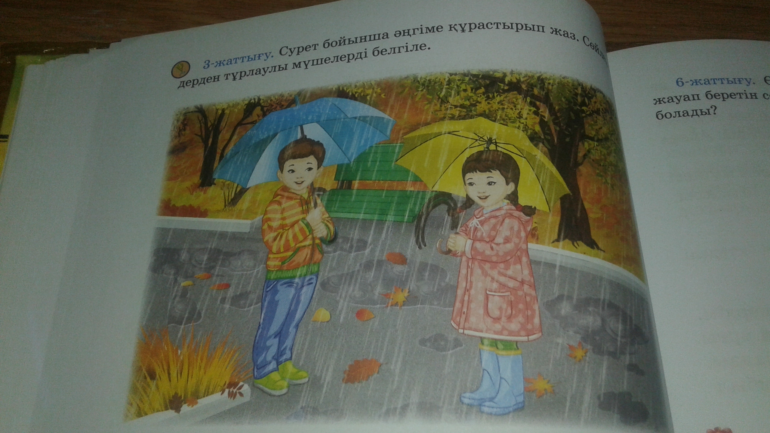 Күн суа бастады.Жамбыр жауып тұр.Жапырақтар түсіп жатыр.Аяжан мен Асет саябақа бара жатыр.Екеулері қолшатырды өздерімен бірге алыпты.Асетікі көк, ал Аяжандікі сары.
