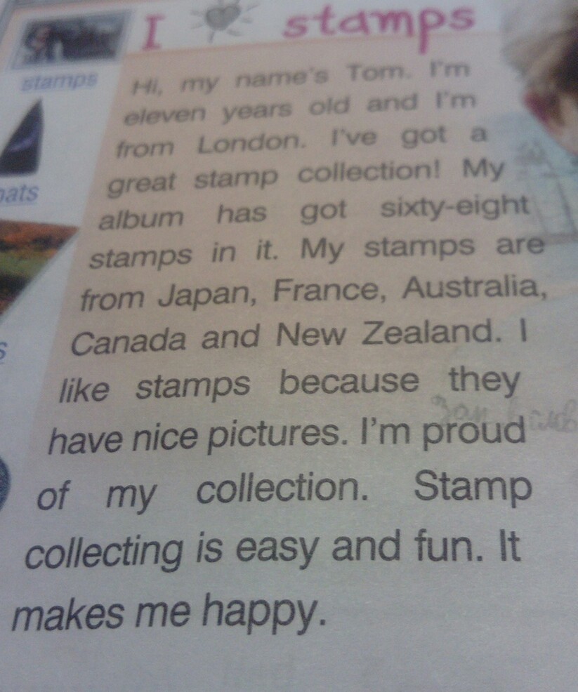 привет моё имя Том мне 8 лет я из Лондона у меня есть большая коллекция марок в моём альбоме 68 марок мои марки из Японии Франции Австралии Канады и Новой Зеландии мне нравятся марки потому-что на них красивые картинки я горжусь своей коллекцией собирать марки легко и весело это делает меня счастливым