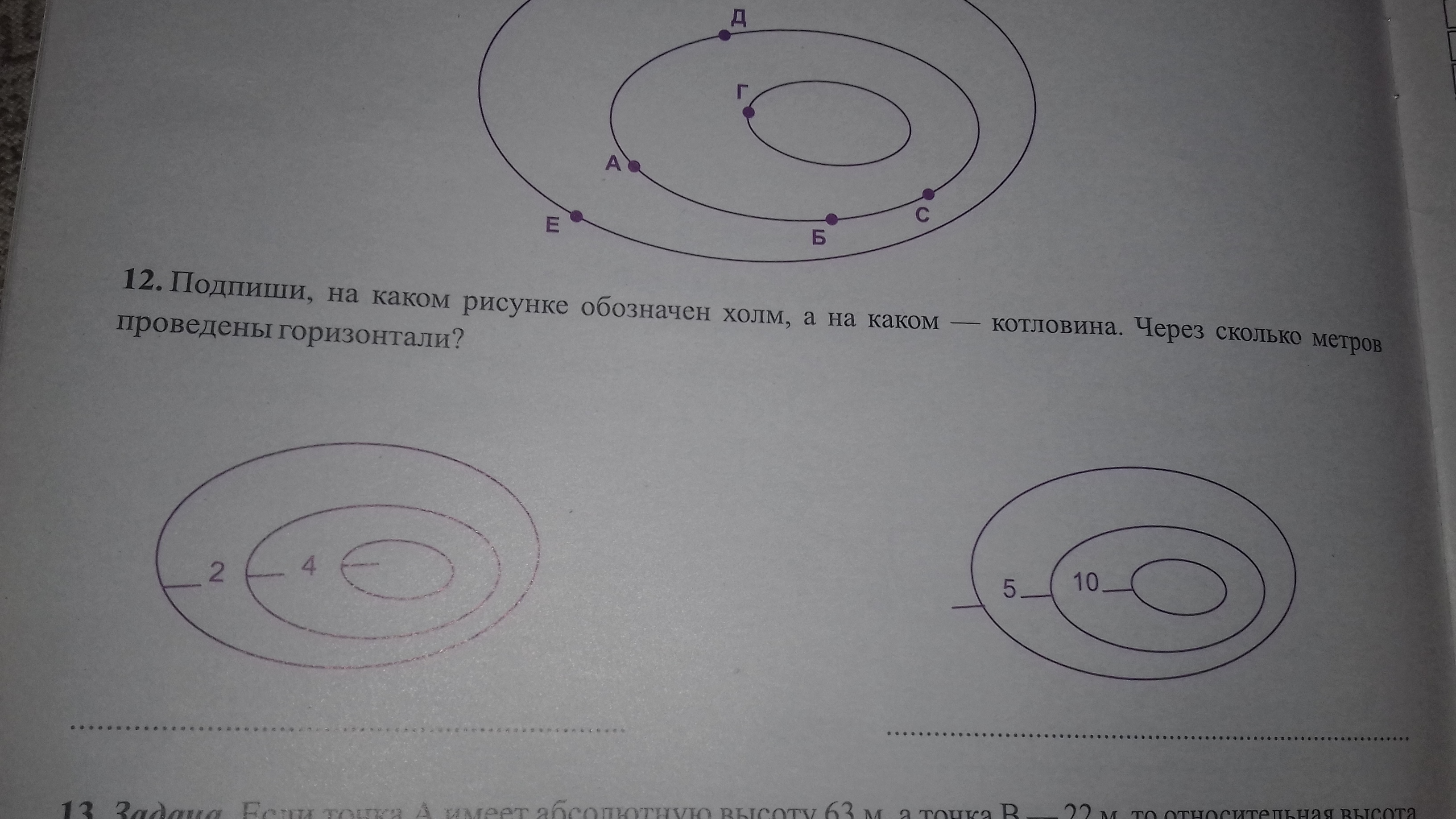 холм на первом, котловина - на втором. горизонтали проведены на первом рисунке через 2 метра, на втором через 5