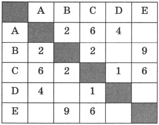 Между городами А, В, С, Б, Е построены дороги, протяжённость которых (в километрах) приведена в таблице.