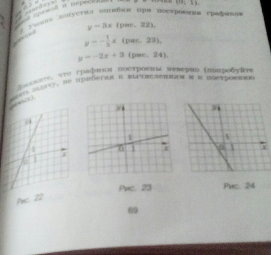 ученик допустил ошибки при построении графиков функций у=3х (рис.22) у=-1/5х (рис 23) у=-2х+3. докажите, что графики построены неверно (попробуйте решить задачу, не прибегая к вычислениям и к построению прямых)