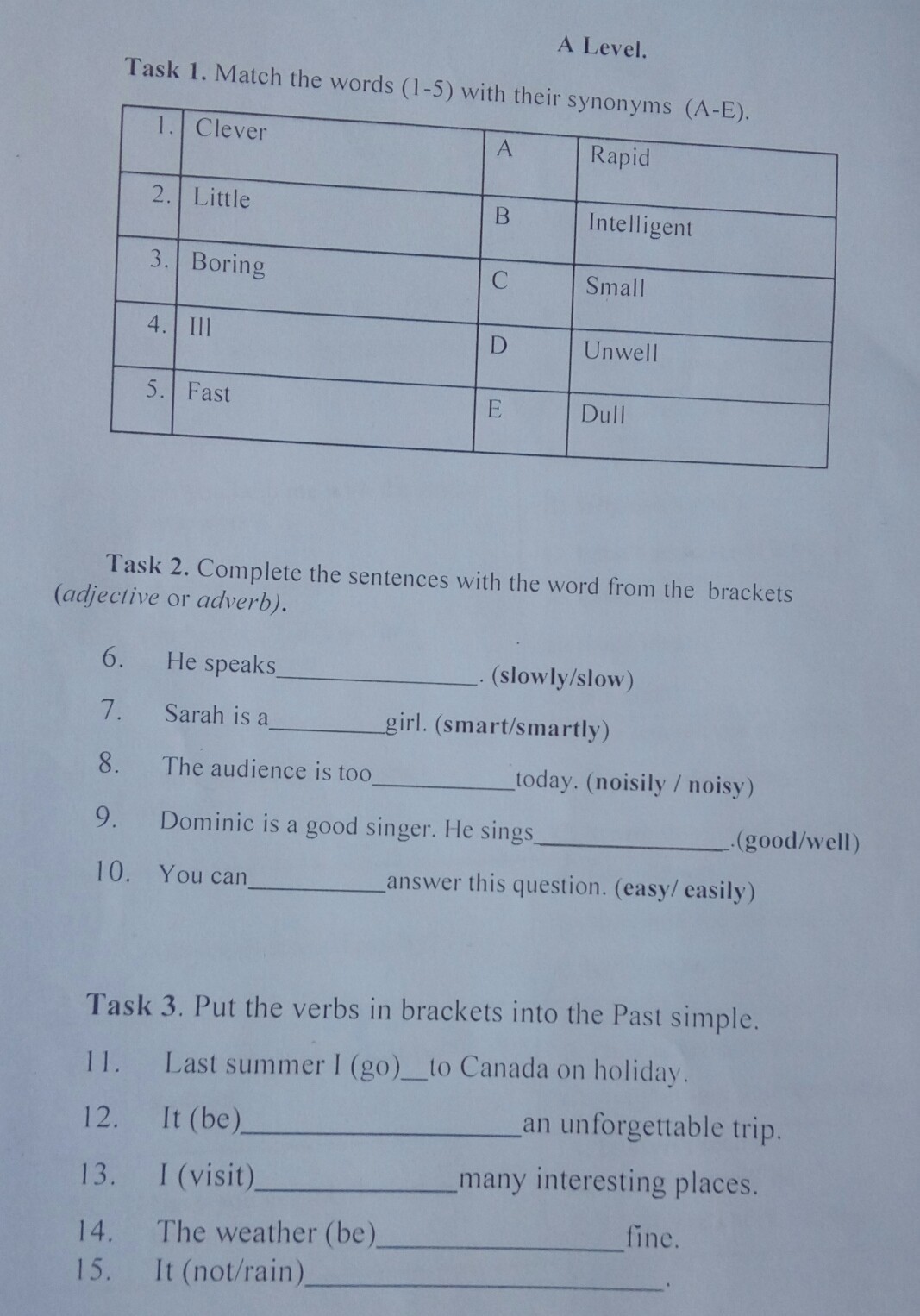 2) 1 slowly; 2 smart; 3 noisy; 4 good; 5 easy