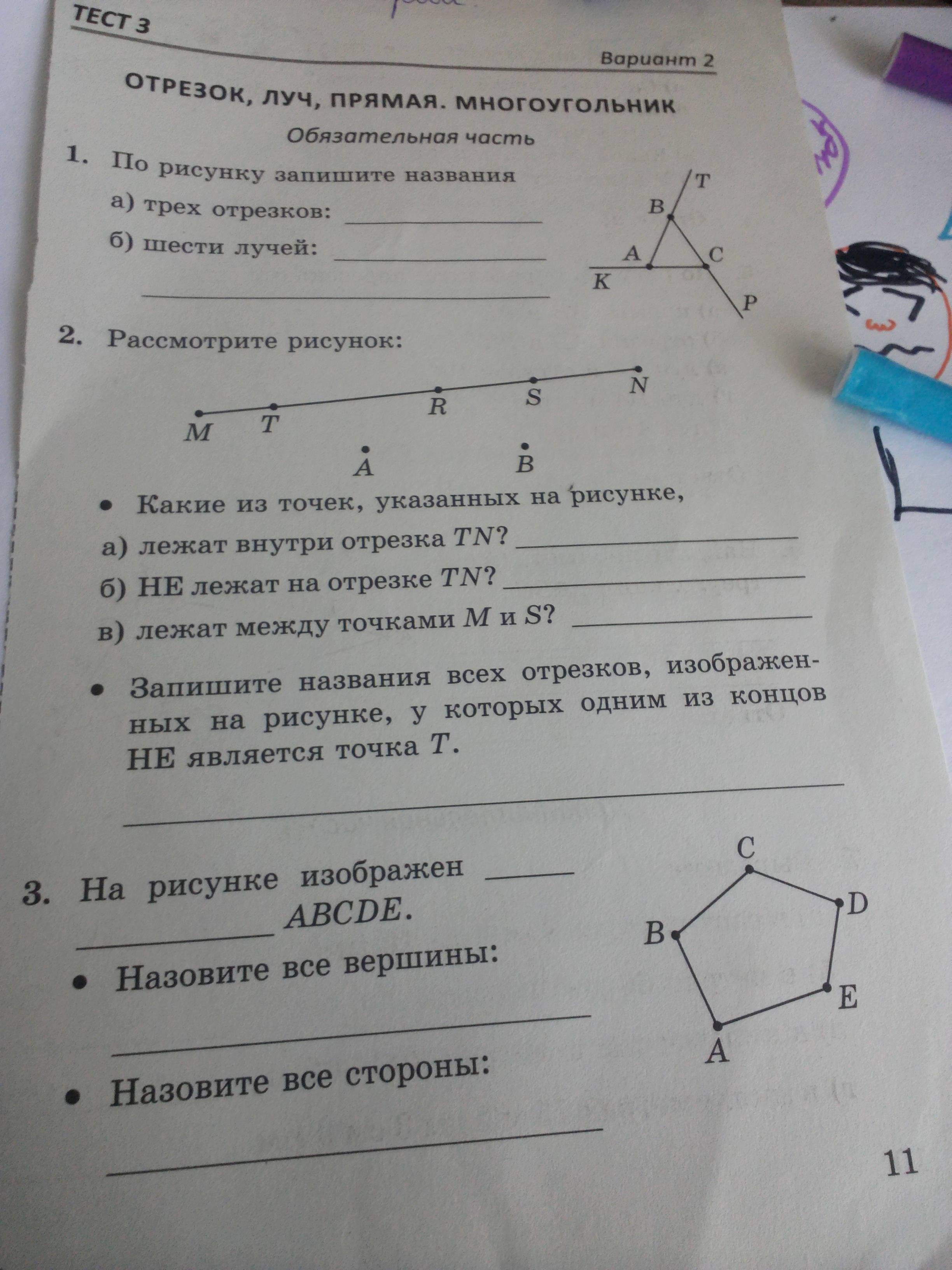 1) AT BP KC (лучи) и AB BC CA 2) a) R S б) M A B в) T R * RS SN RN 3) пятиугольник С B A E D AB BC CD DE AE