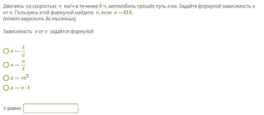 Двигаясь со скоростью v км/ч в течение 8 ч, автомобиль прошёл путь s км. Задайте формулой зависимость s от v. Пользуясь этой формулой найдите v, если s=414.