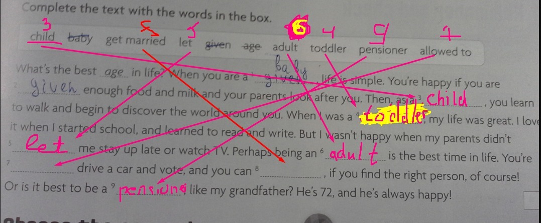 вот, 3) child 4) toddler 5) let 6) adult 7) allowed to 8) get married 9) pensioner