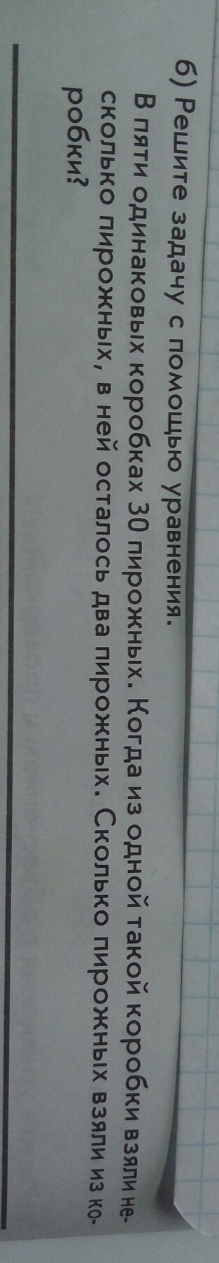 Решите задачу с помощью уравнения в 5 одинаковых коробках 30 пирожных когда из одной такой коробки взяли несколько пирожных в ней осталось 2 пирожных Сколько пирожных взяли из коробки