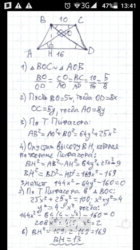 основы равносторонней трапеции равны 10 см и 16 см, а ее диагонали перпендикулярны. Найдите высоту трапеции
