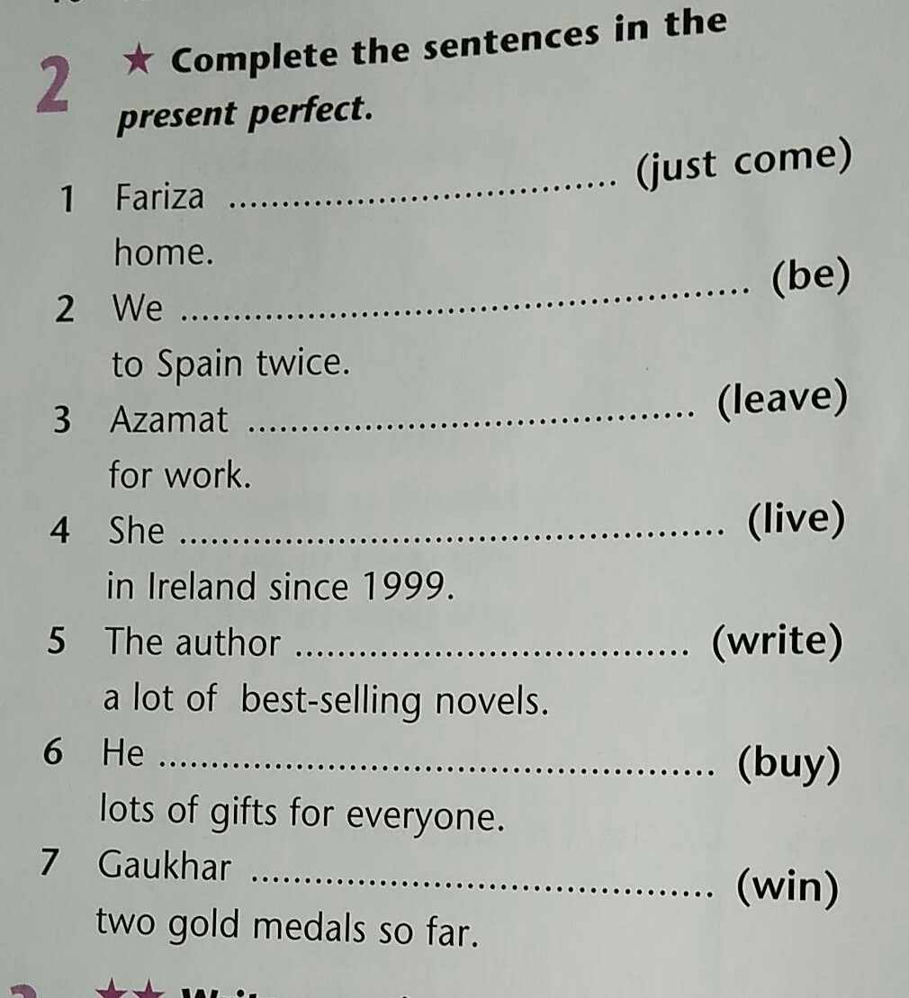 1 Fariza has just come home 2 We have been to Spain twice 3 Azamat has left for work 4 She has lived in Ireland since 1999 5 has written 6 has bought 7 has won