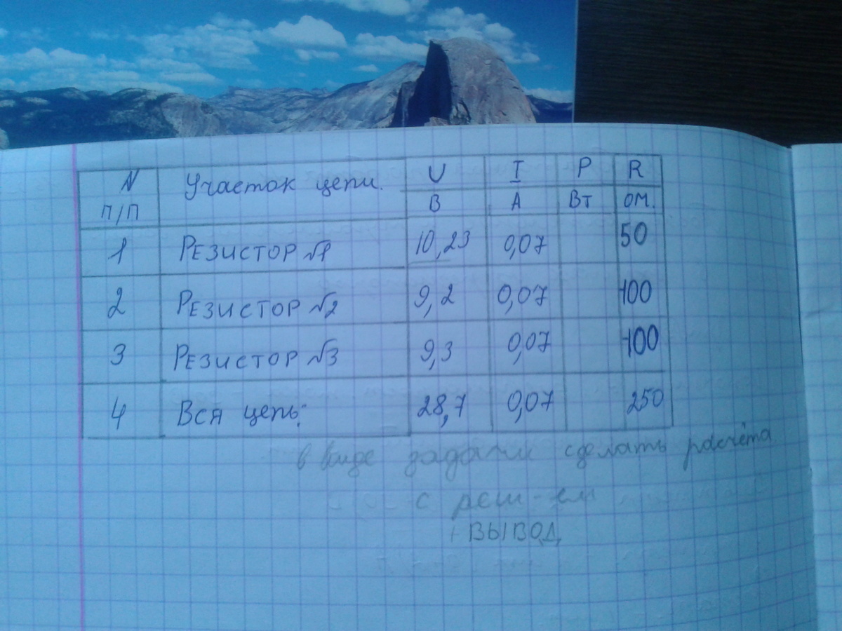 Если начать подставлять цифры из таблицы в формулы то не получим совпадений. значит либо неверно сняты показания с приборов, либо в задаче необходимо учитывать внутреннее сопротивление источника тока, или может быть добавочное сопротивление вольтметра или шунтовое у амперметра?