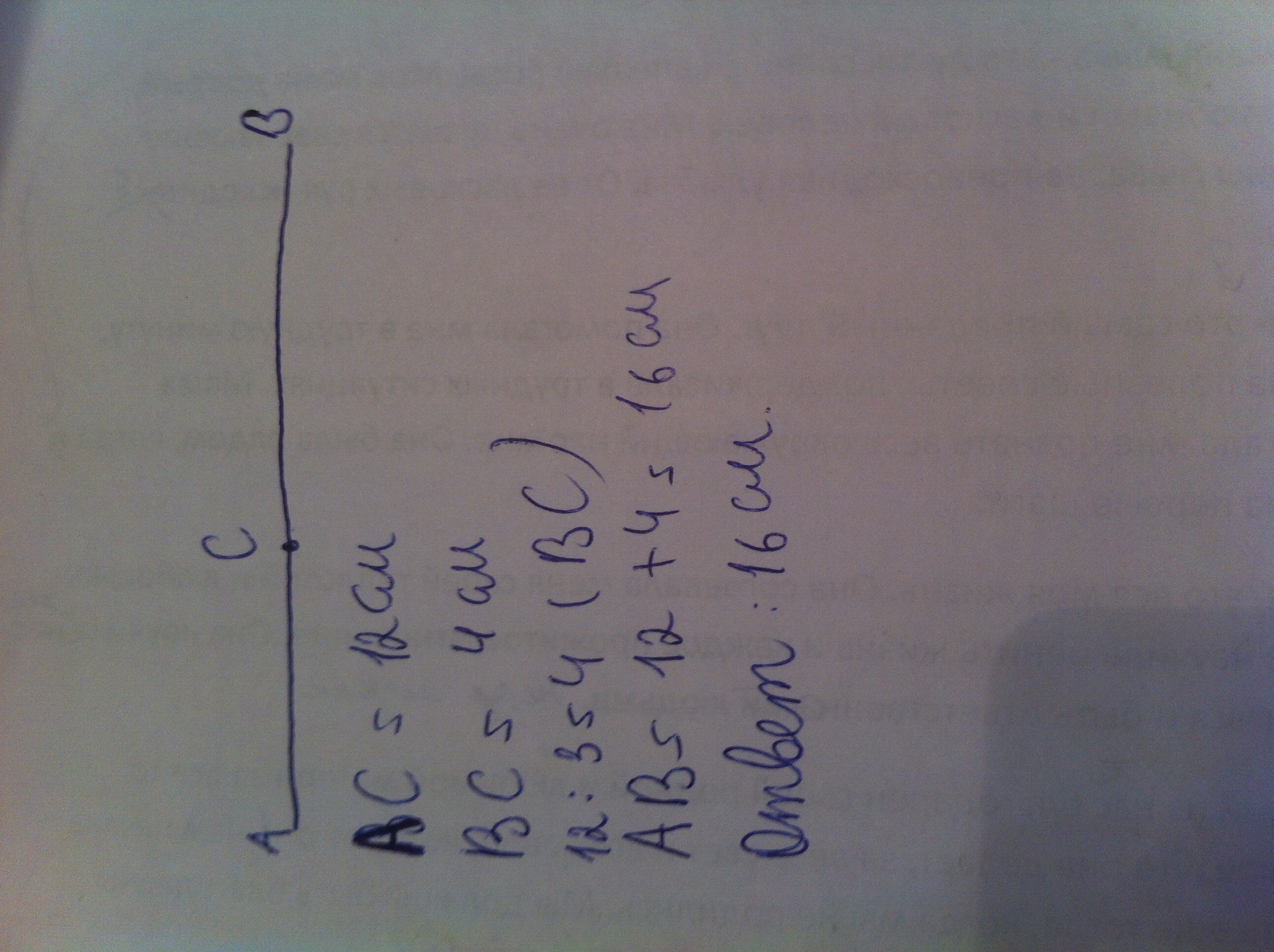 Точка С принадлежит отрезку AB. Найти длину отрезка, если длина отрезка AC равна 12 см, а отрезок BC составляет третью часть отрезка AB.