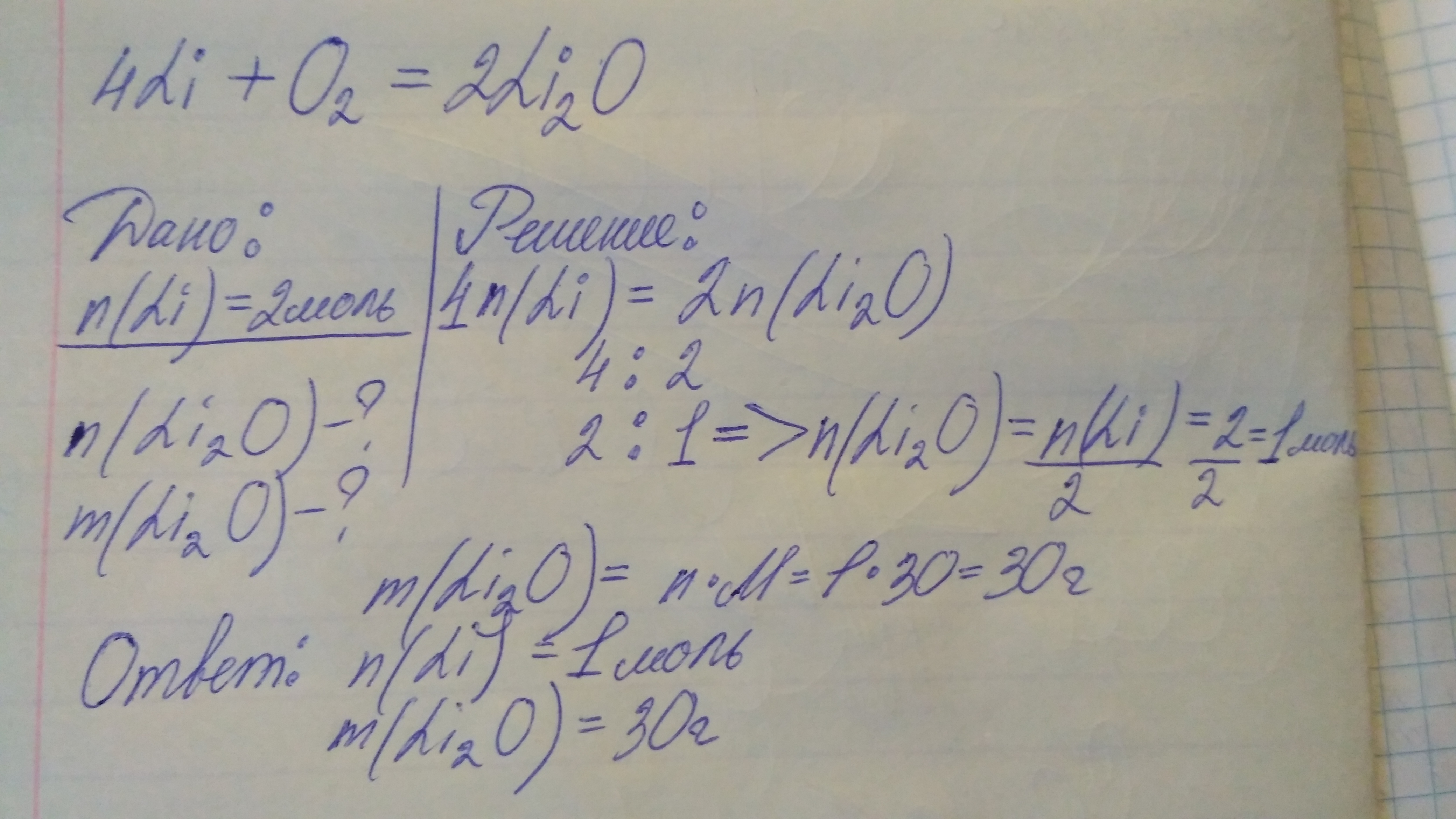 Найти количество вещества и массу получившегося Li20, если в реакцию с кислородом выступило 2 моль лития