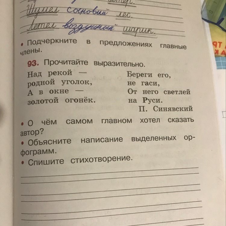Уголок- сущ, родной- прил, рекой- сущ, береги-гл, гаси- гл, огонёк-сущ, светлей- обстоятельство.