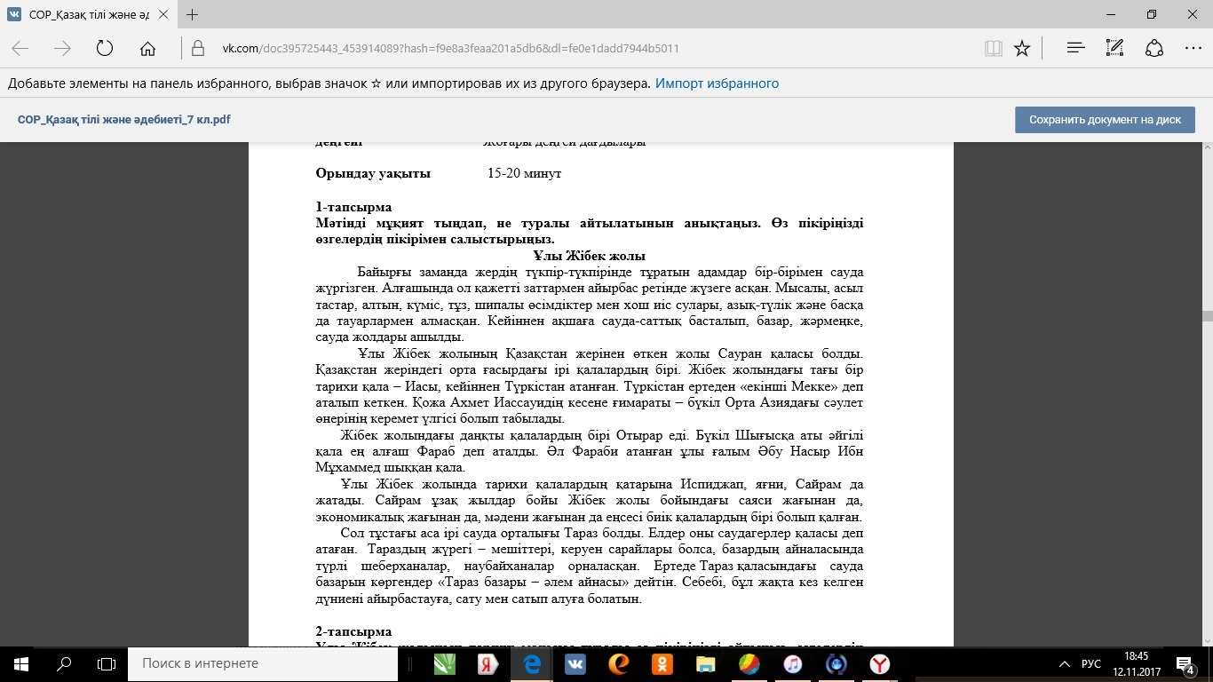 Ұлы Жібек жолы арқылы жердің түкпір түкпірінен келіп сауда жасаған.Ұлы Жібек жолының Қазақстаннан өткен жері Сауран қаласы болды.Жібек жолындағы даңқты қала ол Отырар болды.Жалпы бұл мəтіннің мəні Ұлы Жібек жолы-сауда жəрмеңкелердің басты жері болды.