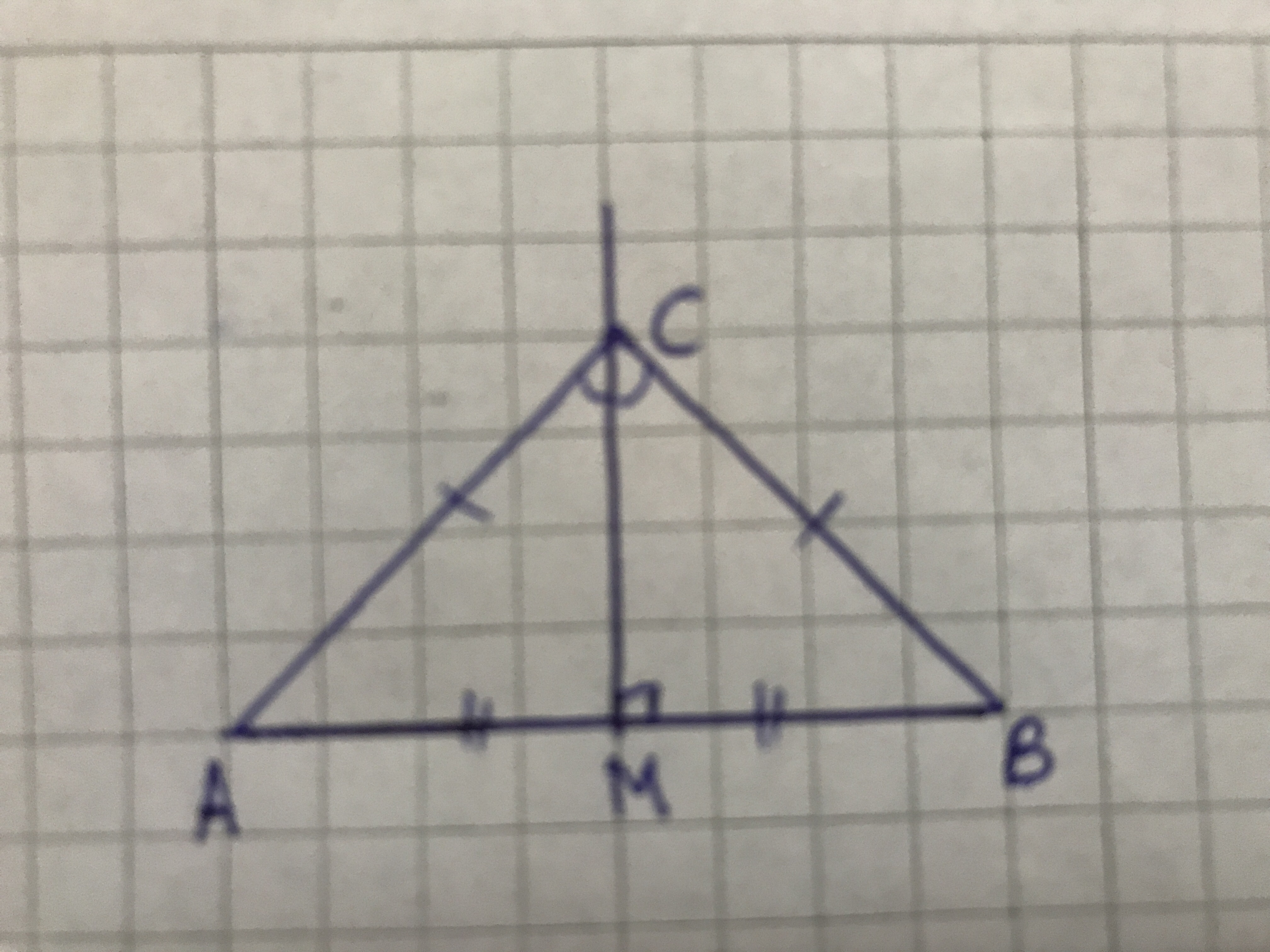 На середине проведём перпендикуляр это уже говорит о том, что AM=MB также что образуется прямой угол ну и CM ещё медиана а значит треугольник равнобедренный т. к. В равнобедренном треугольнике высота проведённая из вершины является медианой и биссектрисой...