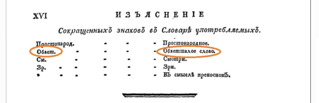 В Словаре Академии Российской 1789г. встречается помета "обвет.".Какая помета соответствует ей в современных словарях?