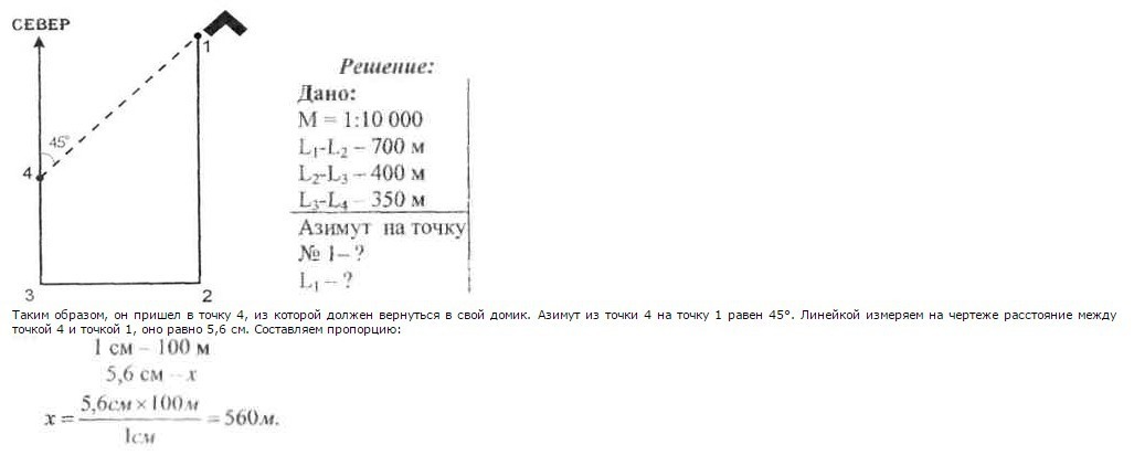 Покажите путь лесника на плане, масштаб которого 1:10 000, если он прошел от дома лесника на юг 700 метров, потом повернул на запад и прошел 400 метров, затем на север и прошел в этом направлении 350 метров. Определите азимут и расстояние от последней точки к дому лесника.