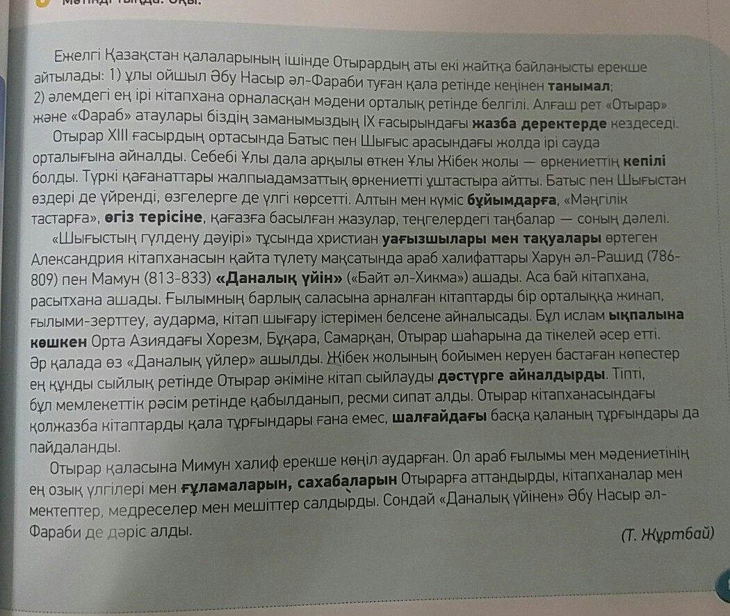 Ежелгі Қазақстан қалаларынын ішінде Отырардын аты екі жайтқа байланысты ерекше айтылады:1) улы ойшыл Əбу Насыр əл Фараби туған қала ретінде кенінен танымал. Отырар 13 ғасырдын ортасында Батыс пен Шығыс арасындағы жолда ірі сауда орталыгына айналады. Туркі қағанаттары жалпыадамзаттын өркениетін уштастыра айтты. Батыс пен Шығыстан өздері де уйренді. Отырар қаласына Мимун Халиф ерекше көніл аударған. Отырарға мешіттер, медресселр, мектептер, кітапханалар т.б салдырды.