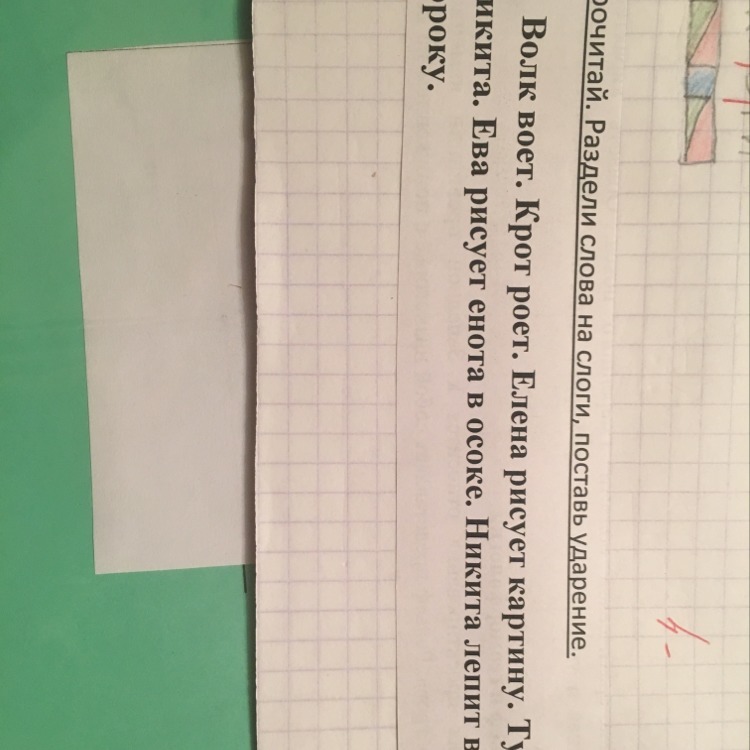 вОлк вОет. крОт рОет. елЕна рисУет картИну. Ева риСует енОта в осОке. никИта (а дальше не видно)