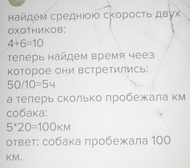 два охотника одновременно отправились навстречу друг другу из двух поселков, расстояние между которыми 18км. первый охотник шёл со скоростью 5км/ч, а второй - 4км/ч. собака первого охотника бежала со скоростью 7км/ч. собака сразу же побежала навстречу второму охотнику, встретила его и побежала навстречу первому и т.д. пока охотники не встретились. сколько километров пробежала собака?
