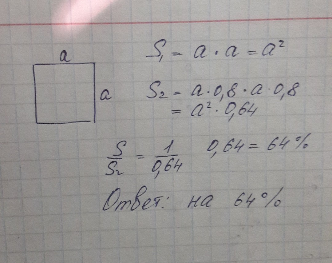 Сторону квадрата уменьшили на 20%.На сколько процентов уменьшилась его площадь?(применяя площадь прямоугольника)