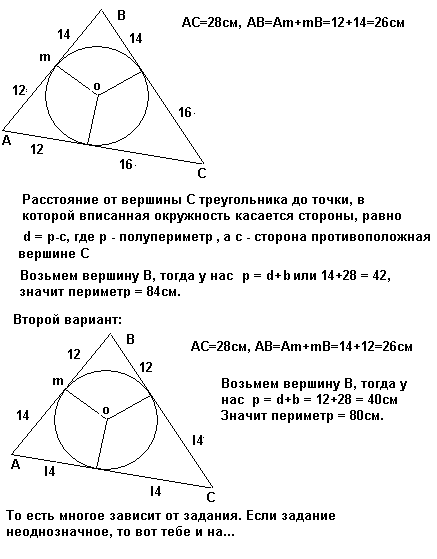 1 ) в треугольнике одна из его сторон равна 28 см , а другая сторона делится точкой прикосновения , вписанного в треугольни круга , на отрезки 12 см и 14 см .2 ) найдите периметр треугольника