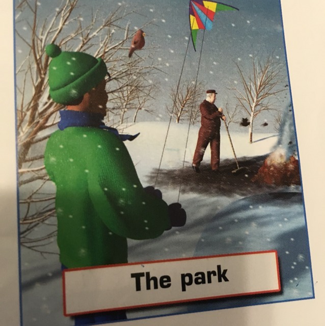 На этой картинке мы видим мужчину среднего возраста, который одет в коричневую одежду. Он разжигает огонь. Рядом мы видим воздушного змея который летает в небе. Там немного деревьев. На одном из деревьем сидит коричневая птица. На переднем плане там стоит мальчик одетый в зеленую куртку, шапку и голубой шарф.