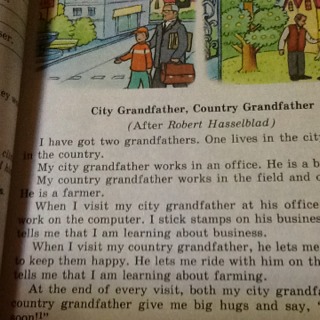 У меня есть двое дедушек,один из них живет в городе другой в деревне.Дедушка который живет в городе работает в оффисе.Второй мой дедушка работает на ферме.Когда я посещаю своего дедушку в офисе ,он работает за компом.И он учит меня понимать в бизнессе.Когда я посещаю своего второго дедушку,он учит меня как быть счастливым ,и он учит меня как работать на ферме