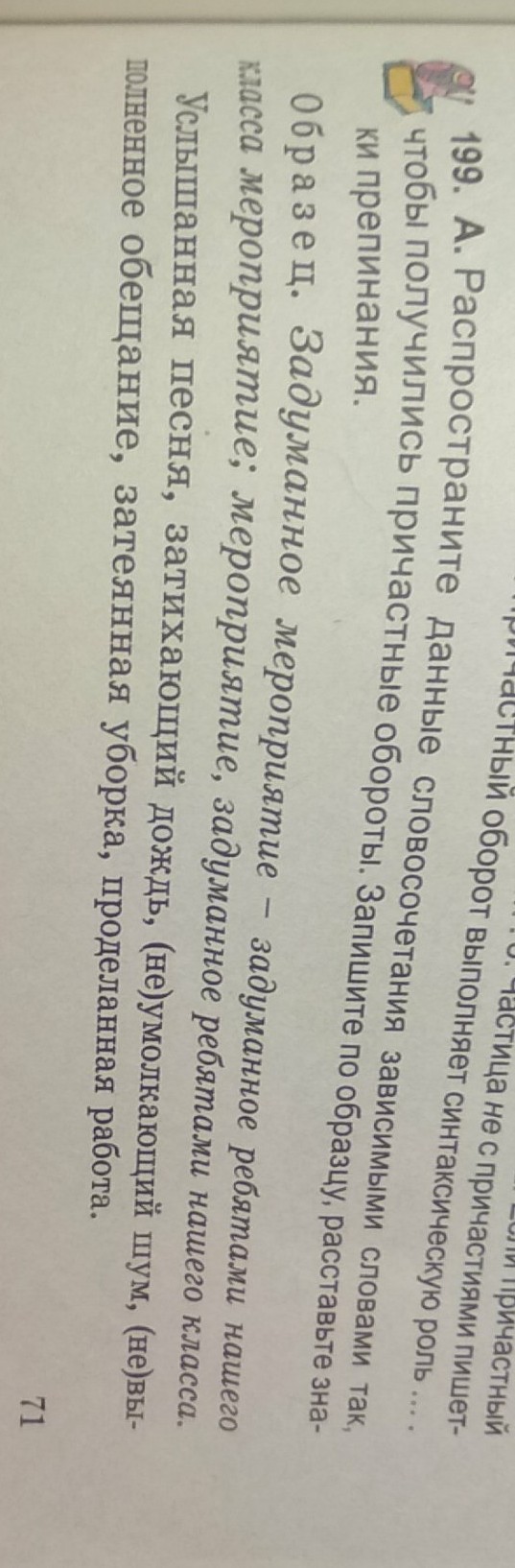 1) Услышанная мною песня; песня, услышанная мною; 2) медленно затихающий дождь; дождь, затихающий медленно; 3) долго неумолкающий шум; шум, долго не умолкающий; 4) невыполненное моим другом обещание; обещание, невыполненное моим другом; 5) затеянная семьёй уборка; уборка, затеянная семьёй; 6) проделанная исследовательской группой работа; работа, проделанная исследовательской группой;