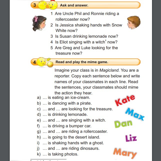 Просто замість пропусків постав імена однокласників на англійській мові і нехай без слів покажуть дії сказані в реченнях