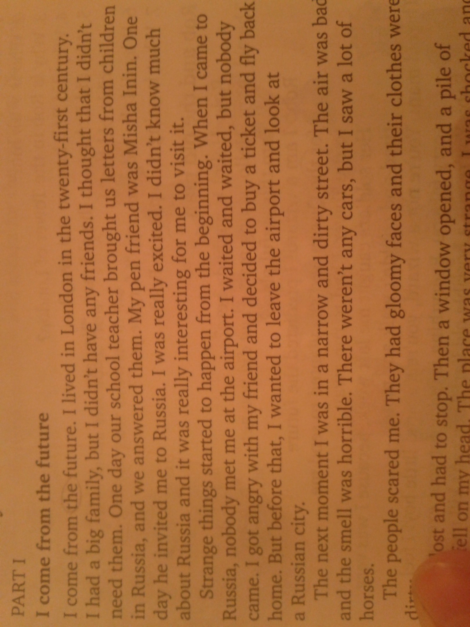 я прибыл из будущего,я живу в 21 веке. У меня большая семья,но совсем нет друзей. Я думаю,что я не нуждаюсь в них. Однажды наш учитель дал нам письма детей из России,и мы ответили им. Мой друг по переписке-Миша Инин,однажды он пригласил меня в Россию. Я не зналм ногого о России, и посетить ее было интересно для меня) вот так