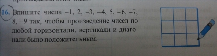 У вас положительных чисел 3, а минус на минус дает плюс. Поставьте одно отрицательное число в левую верхнюю клетку. Второе - в самую правую этажом ниже. Третье еще ниже посередине