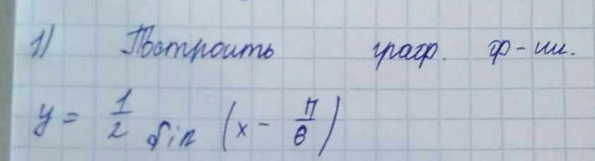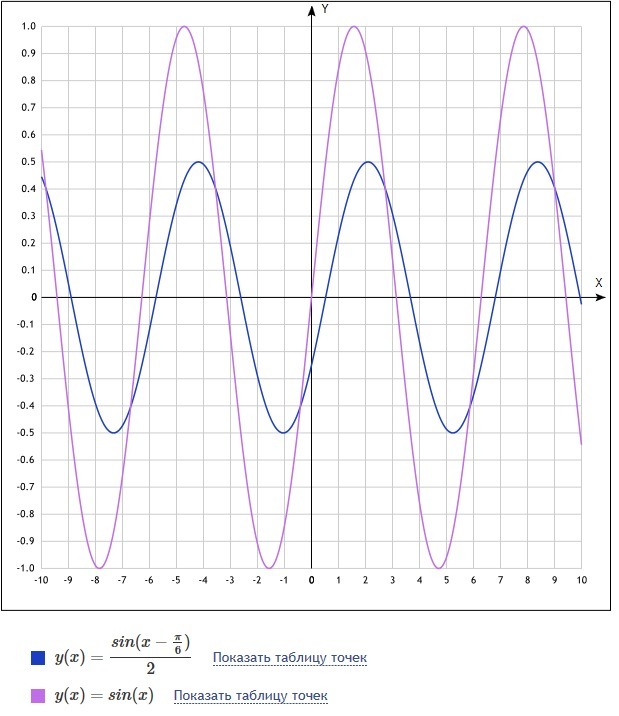 график у синего цвета, он получен из графика sin x(розового цвета) при сдвиге аргумента х вправо на pi/6 и сужением по оси у в два раза за счет коэффициента перед синусрм
