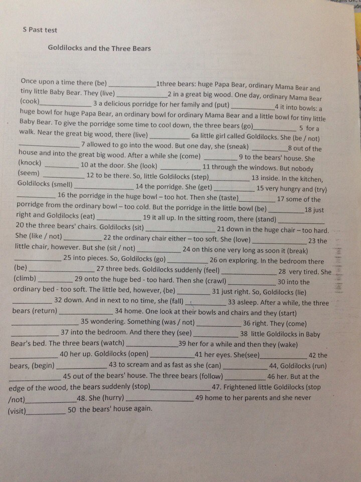 were, lived, cooked, put, went, lived, were/weren't, sneaked, came, knocked, looked, seemed, stepped, smelled, got, tried, tasted, was, ate, stood, sat, liked/didn't like, loved, sat/didn't sit, broke, went, was, felt, crawled, was, lied, fell, returned, started, was/ was not, came, saw, watched, woke, opened, saw, began, could, ran, followed, stopped/ didn't stop, hurried, visited.