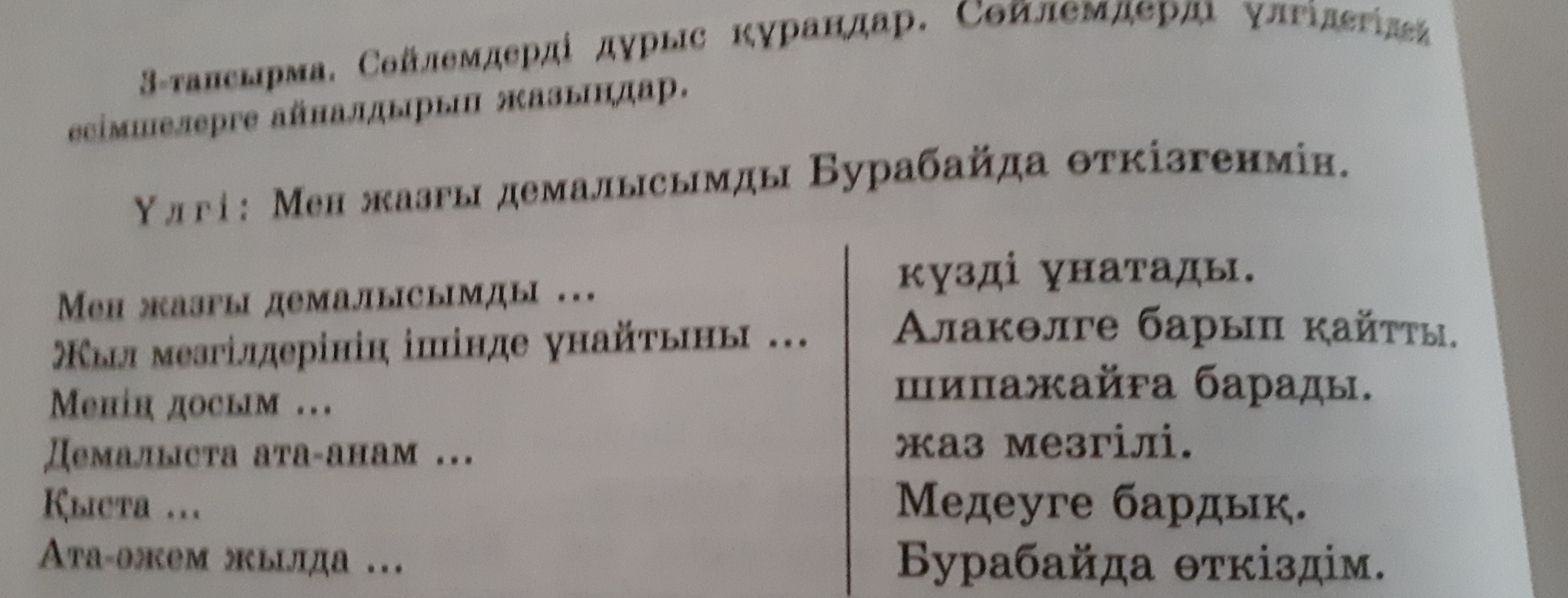Жыл мезгілдерінің ішінде ұнайтыны жаз мезгілі. Менің досым күзді ұнатады. Демалыста ата-анам Алакөлге барып қайтты. Қыста Медеуге бардық. Ата-әжем жылды шипажайға барады.