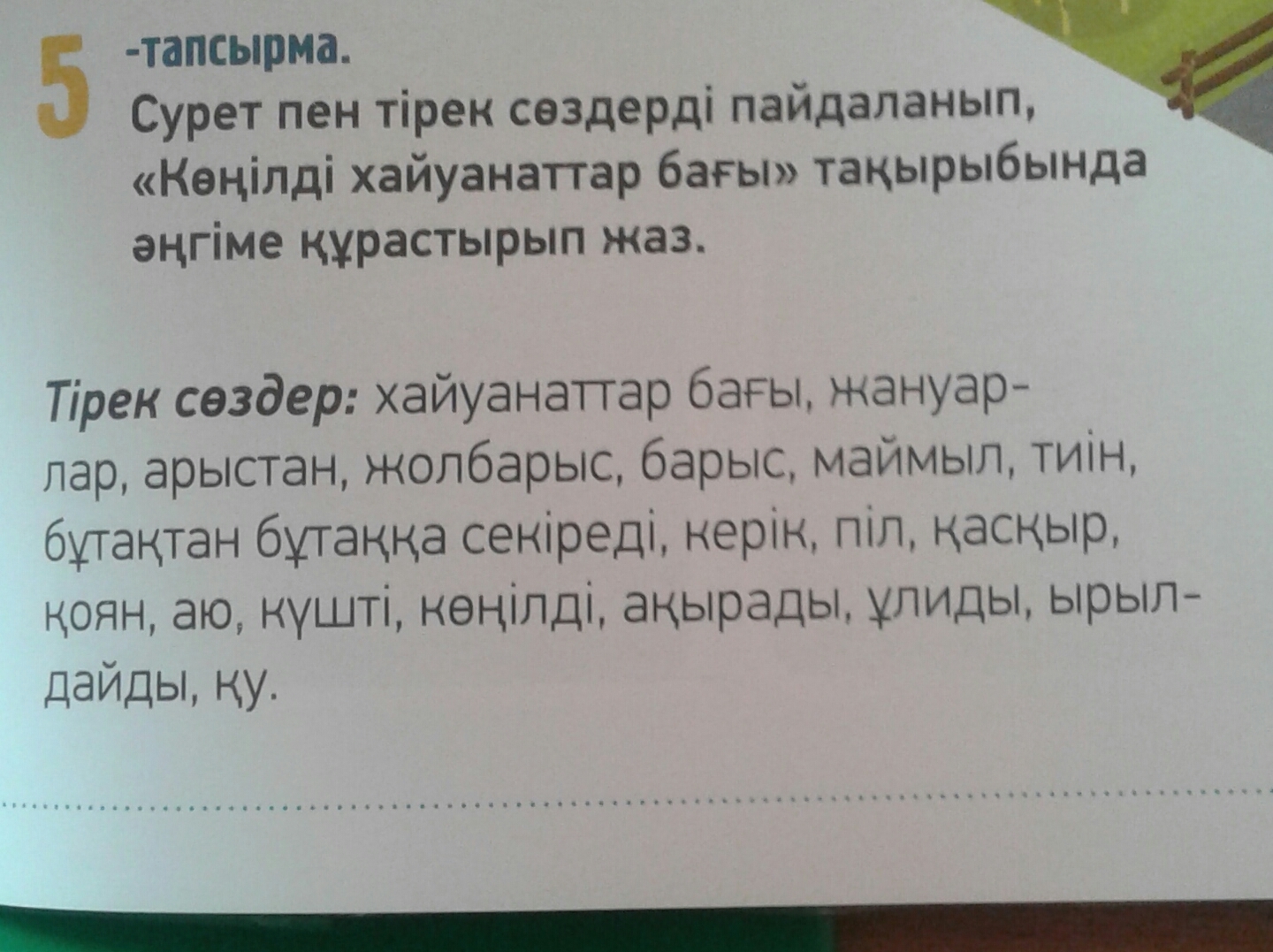 Первое предложение:Мен коп жануарларды білемын,олар:піл,каскыр,маймыл,тиін,коян жане т.б