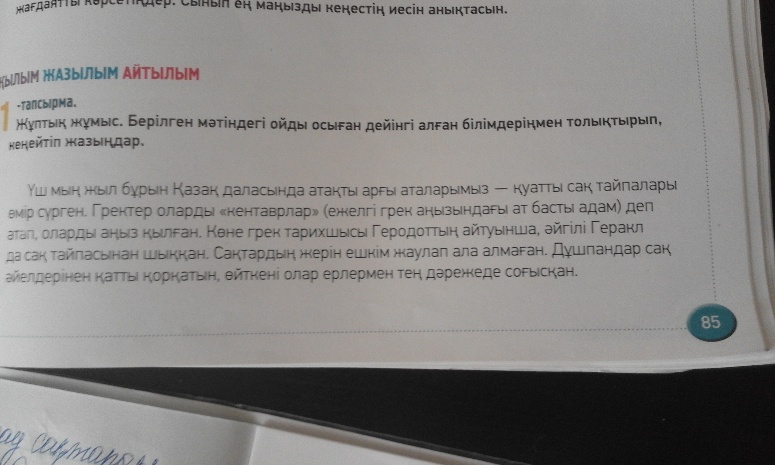 Три тысяча лет назад на Казахской земле жили наши дальние прадеды - мощные племя сак. Греки называли их *кентаврами* . По словам греческого историка Геродота, знаменитый сам Геракл вышел из племя сак . Никто не смог завоевать землю саков. Враги боялись женщин саков, так как они воевали на равне с мужчинами