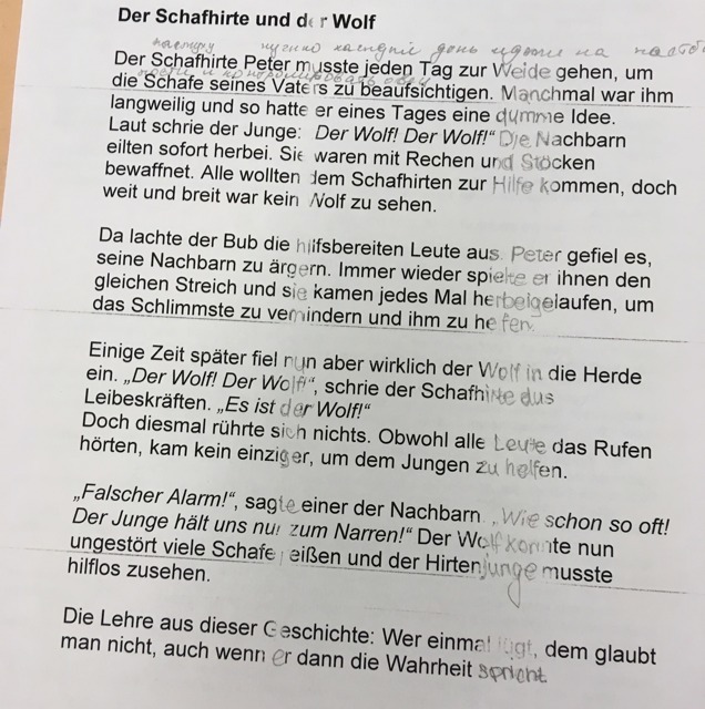 Пастуху Петеру нужно каждый день ходить на пастбище, что бы пасти овец своего отца. Иногда ему было скучно и однажды ему в голову пришла глупая идея. Мальчик громко закричал: волк!волк! Соседи тотчас поспешили к нему. Они были вооружены граблями и палками. Все хотели придти на помощь пастуху, но ни в дали ни по сторонам не увидели никакого волка.