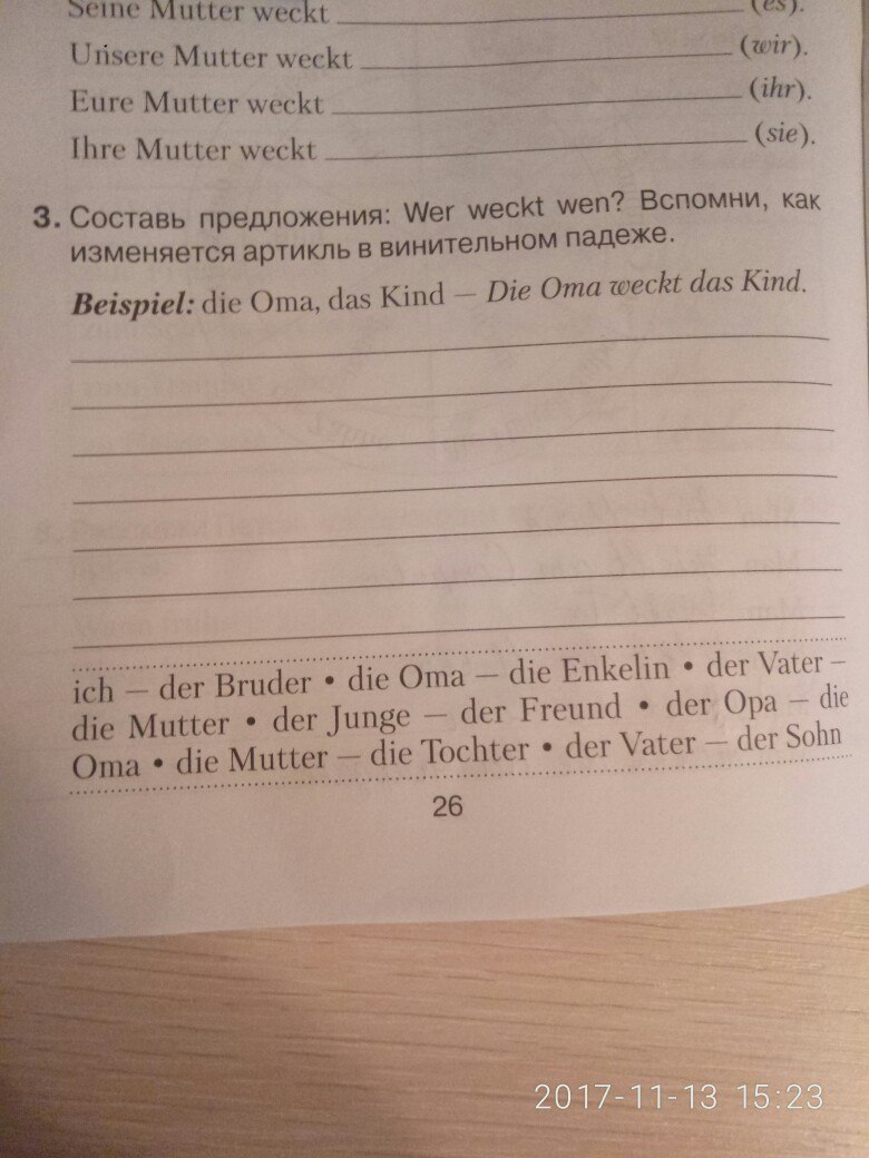 Ich wecke den Bruder, Die Oma weckt die Enkelin, Der Vater weckt die Mutter, Der Junge weckt den Freund, Der Opa weckt die Oma, Die Mutter weckt die Tochter, Der Vater weckt den Sohn.