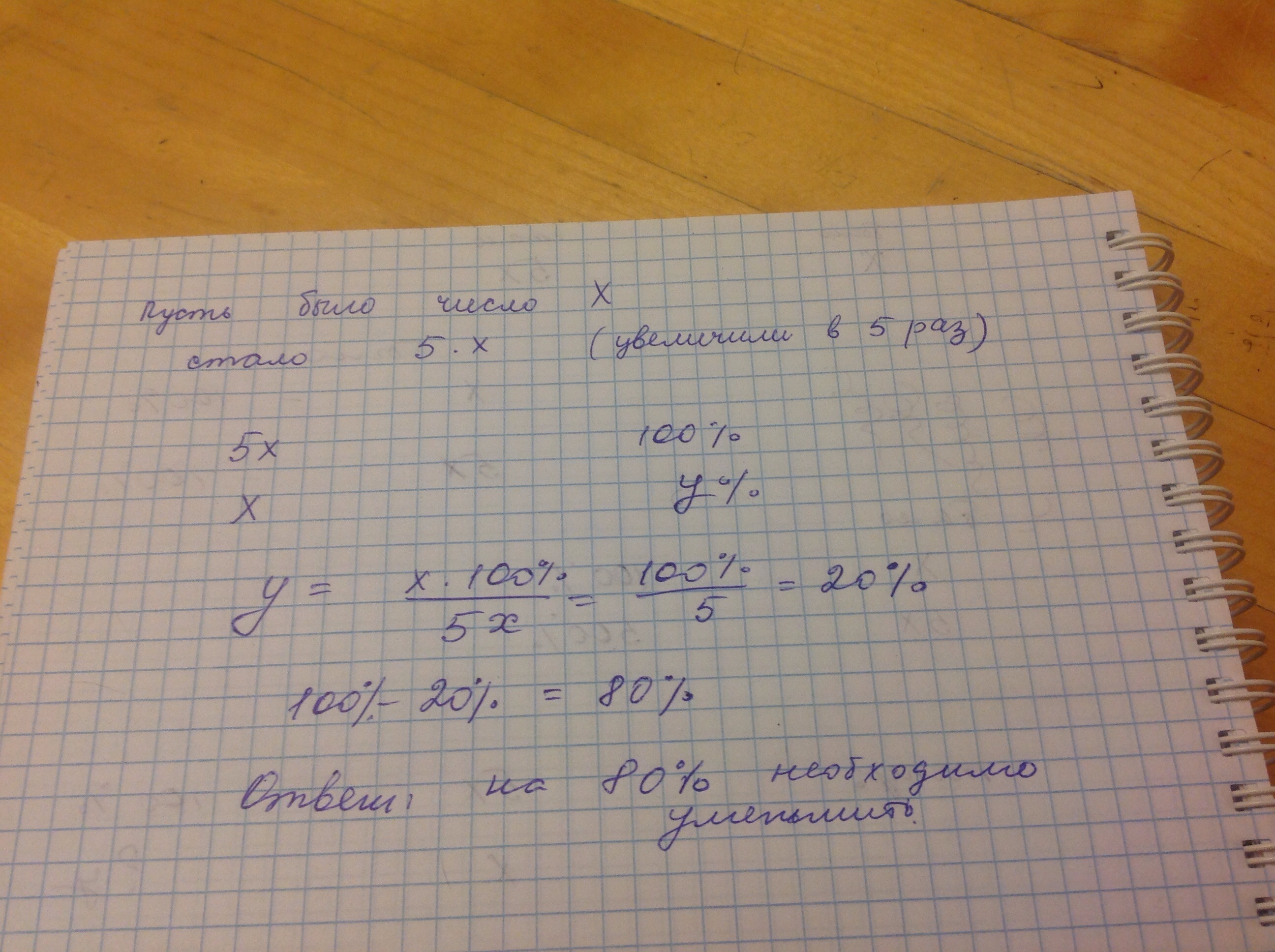 Число увеличили в 5раз. На сколько процентов необходимо уменьшить полученное число, чтобы получить первоначальное?